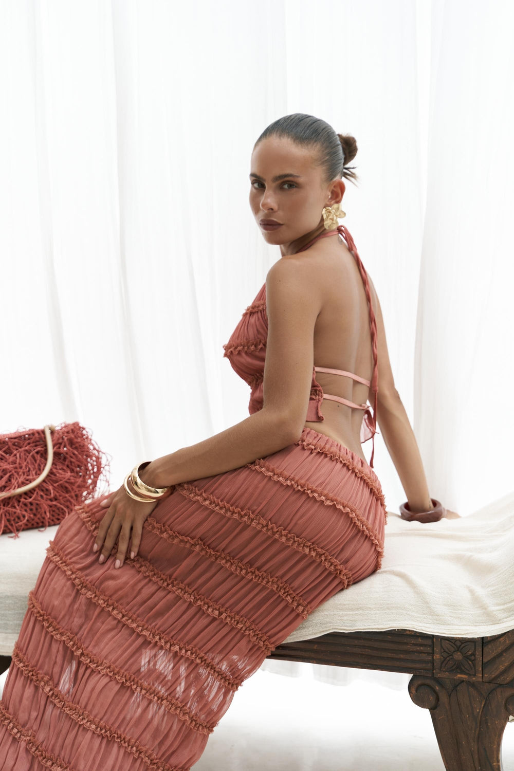 The Penelope Skirt in Indian Red features a high-waisted design crafted from lightweight, unlined fabric that flows elegantly with every step. Its refined silhouette and breathable material make it an ideal choice for sophisticated, effortless dressing.