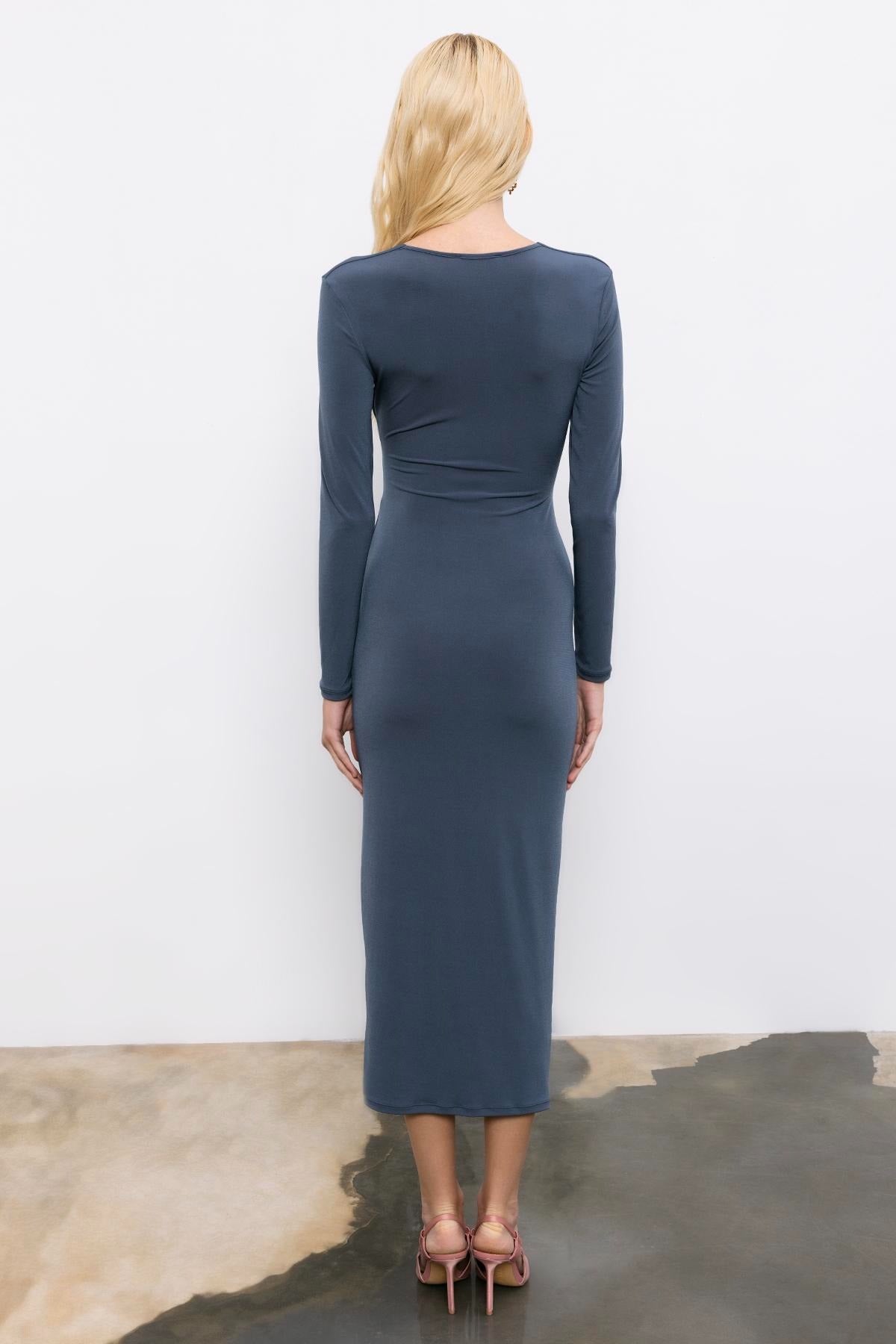 Navy blue dress with long sleeves and a deep neckline on a light gray background
