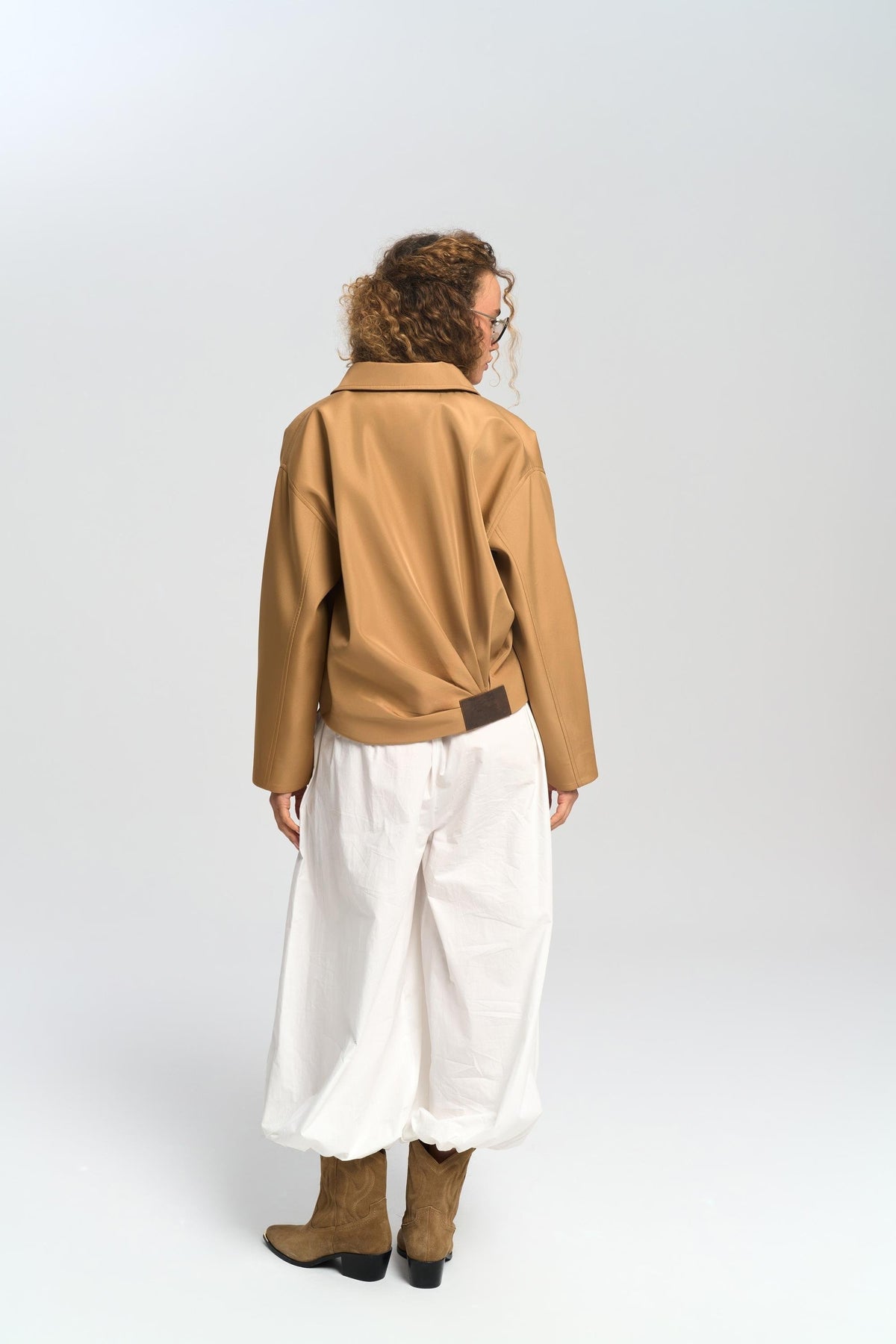 The Callista Bomber Jacket in camel offers a slightly oversized, comfortable fit enhanced by elegant pleat details on both the front and back. Crafted from water-repellent fabric, it provides practical protection against the elements while maintaining a refined silhouette. Functional zippered pockets at the front add convenience without compromising its sleek design, making it a versatile addition to any sophisticated wardrobe.