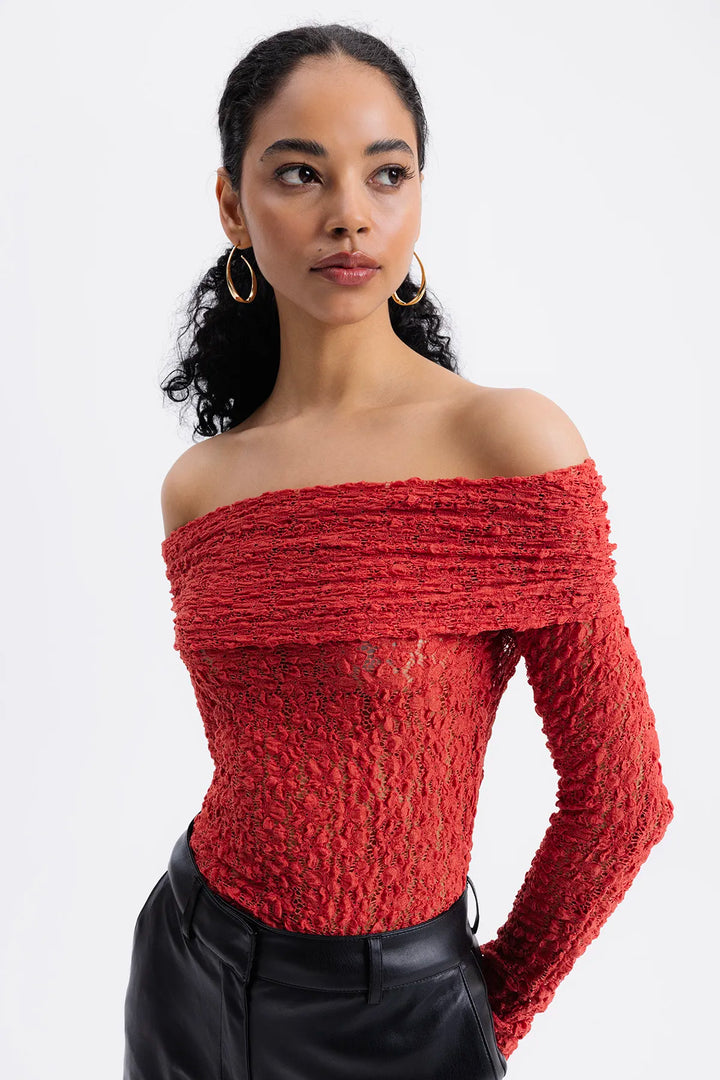 Introducing the Alessandra Off-Shoulder-Red top! This trendy piece features a flattering off-shoulder design that will elevate any outfit. Made with high-quality materials and attention to detail, it's the perfect addition to your wardrobe. Wear it on a date, to a party, or for a night out with friends. Look stylish and confident in the Alessandra Off-Shoulder-Red.