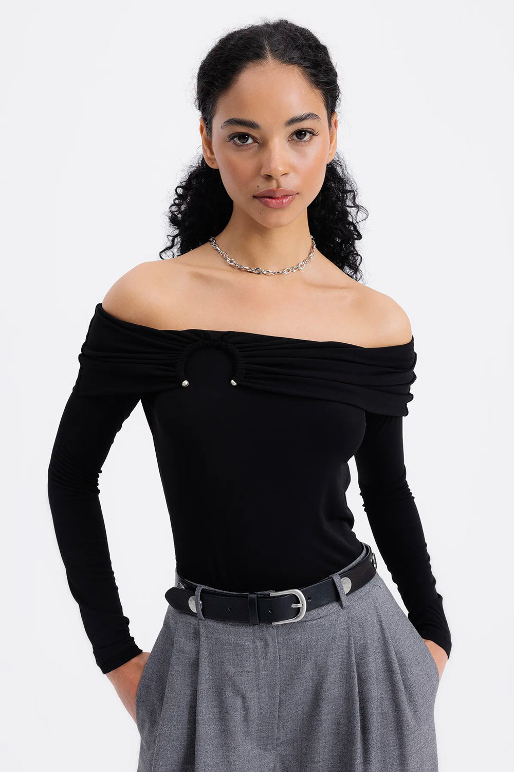 This top is designed with an elegant off-shoulder style, perfect for any occasion. Made with a comfortable and stretchy fabric, it offers a flattering fit for all body types. Show off your shoulders and feel confident in this versatile and stylish top.