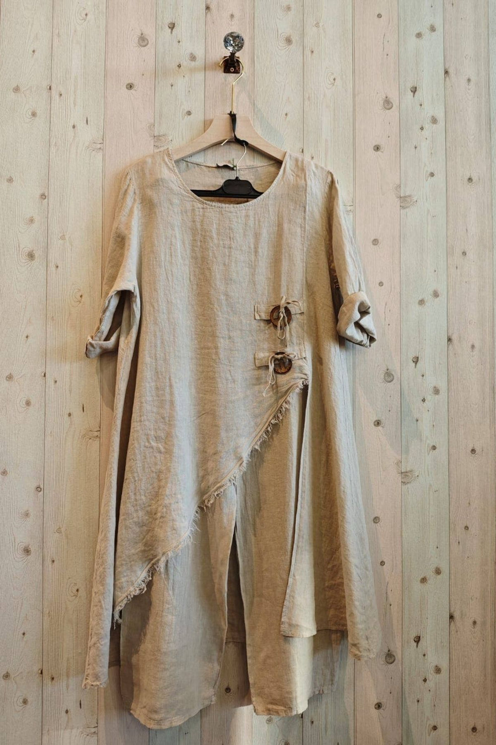 Elevate your wardrobe with this Asymmetrical Linen Tunic in a delicate light green hue. Crafted from breathable linen, its unique silhouette offers a refined yet effortless style. The asymmetrical design adds a subtle architectural interest, making it a versatile piece that transitions seamlessly from casual daywear to elegant evening looks. Experience comfort and sophistication in one timeless tunic.
