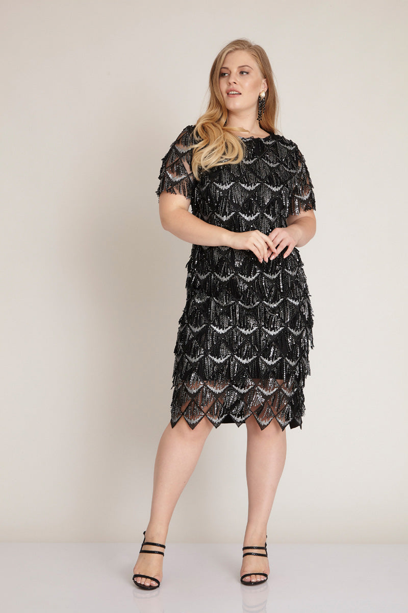 Discover elegance and sophistication in our Black Silver Lora Dress. Perfect for formal events, this knee length dress boasts a shiny black and silver design, creating a stunning and timeless look. Elevate your style and confidence with this must-have dress.