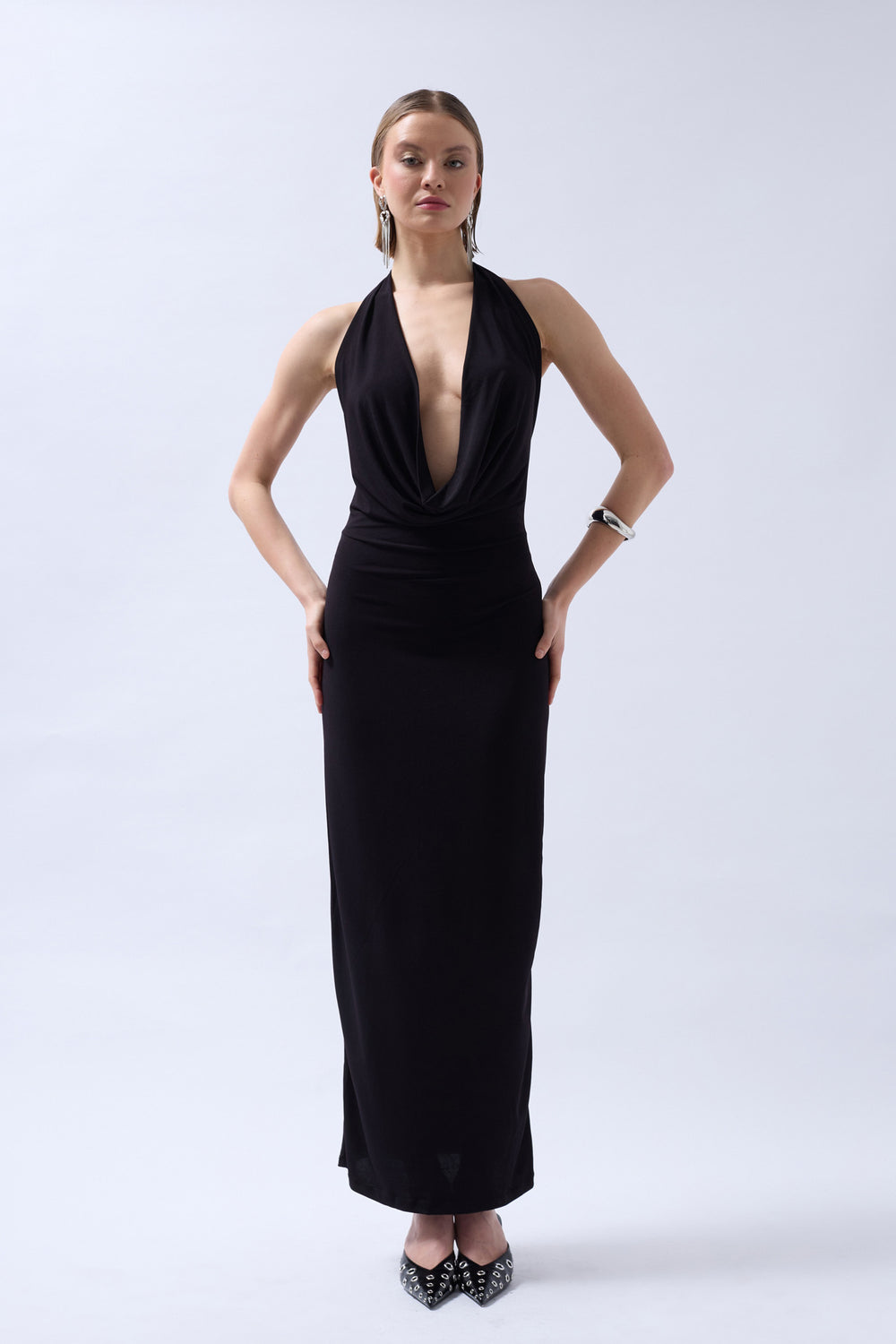 Introducing the Diana Shawl Neck Maxi Dress in elegant black. This dress exudes sophistication with its shawl neck design and fluid maxi length. Perfect for any formal occasion, it will make you feel luxurious and exclusive. Elevate your style and embrace the world of high fashion with this stunning piece.